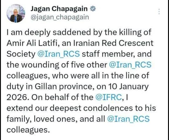 Mr. Chapagain shared his message of sympathy on the social media platform X, stating: “I am deeply saddened by the killing of Amir Ali Latifi, an Iranian Red Crescent Society staff member, and the wounding of five other Iranian Red Crescent colleagues, who were all in the line of duty in Gilan province, on 10 January 2026.”